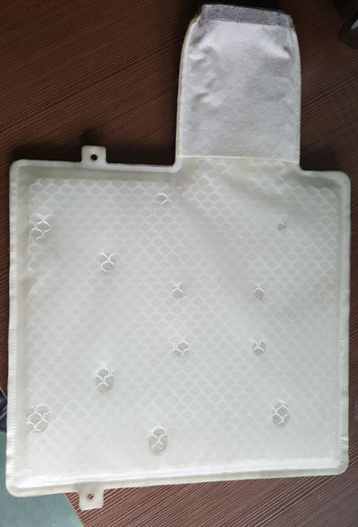座椅通風(fēng)系統(tǒng)生產(chǎn)工藝流程:先要裁切好通風(fēng)網(wǎng)格外形及PU、fleece無紡布外形尺寸待用;工人將第一層PU膜在模具上定位后放入通風(fēng)網(wǎng)格,再放入另一張PU膜定位,最后鋪上一層fleece無紡布定位,點(diǎn)動(dòng)機(jī)器自動(dòng)滑臺(tái)進(jìn)入按鈕,模具帶材料自動(dòng)進(jìn)入后機(jī)頭自動(dòng)下降并對(duì)產(chǎn)品進(jìn)行焊接,通過延時(shí)--熔接--定型--熔斷后上升,自動(dòng)滑臺(tái)退出后人工取件一個(gè)過程。
